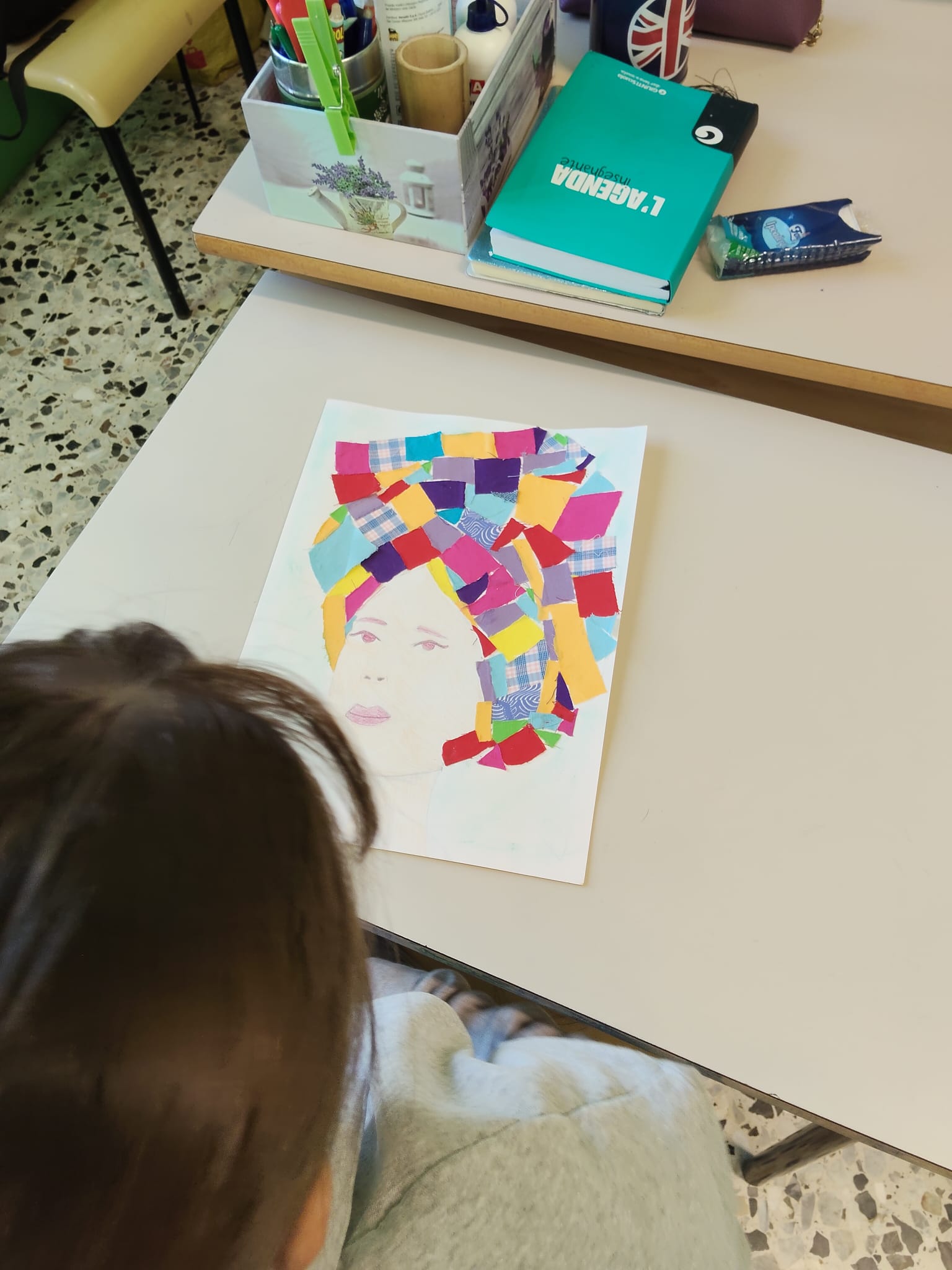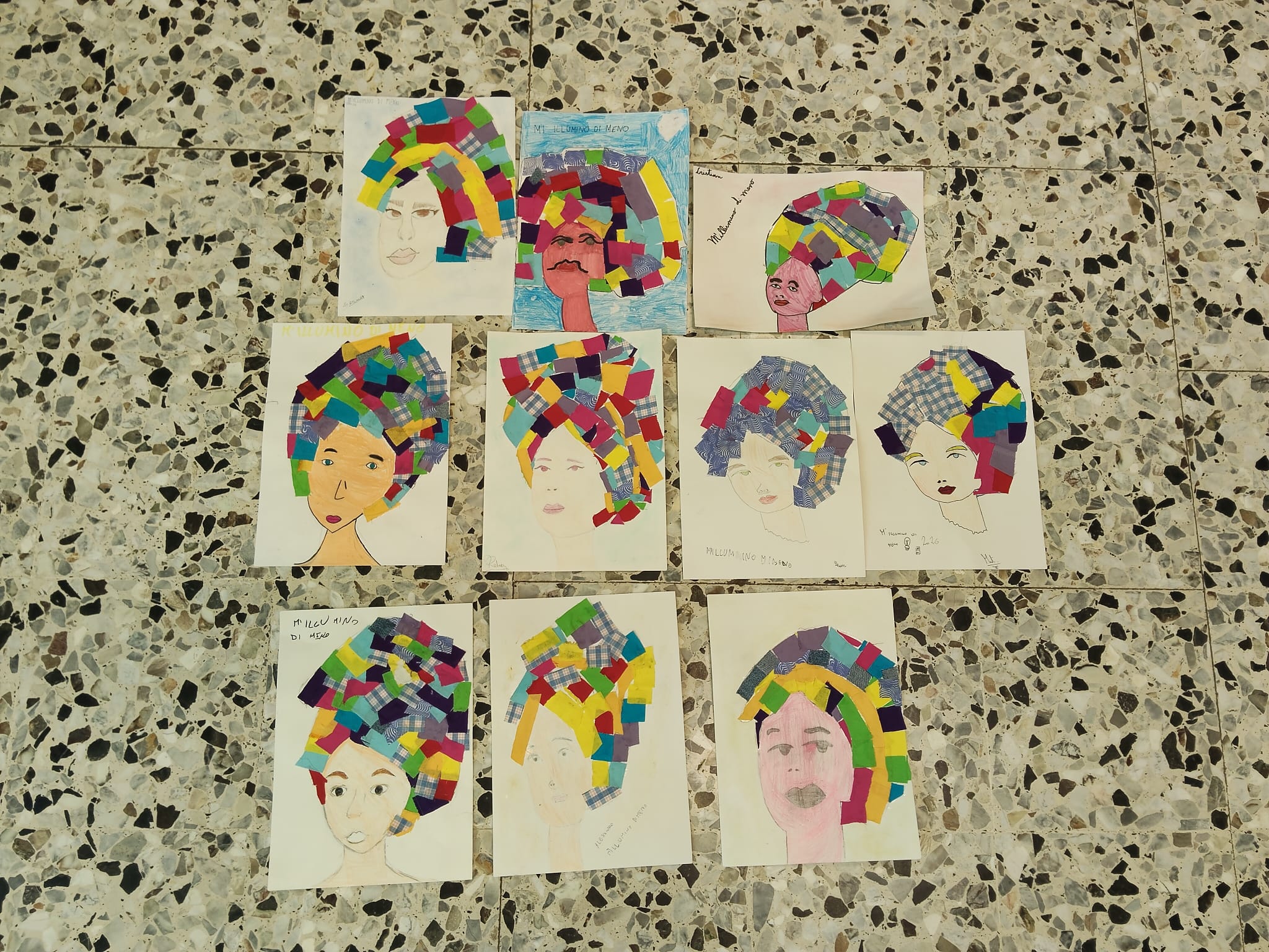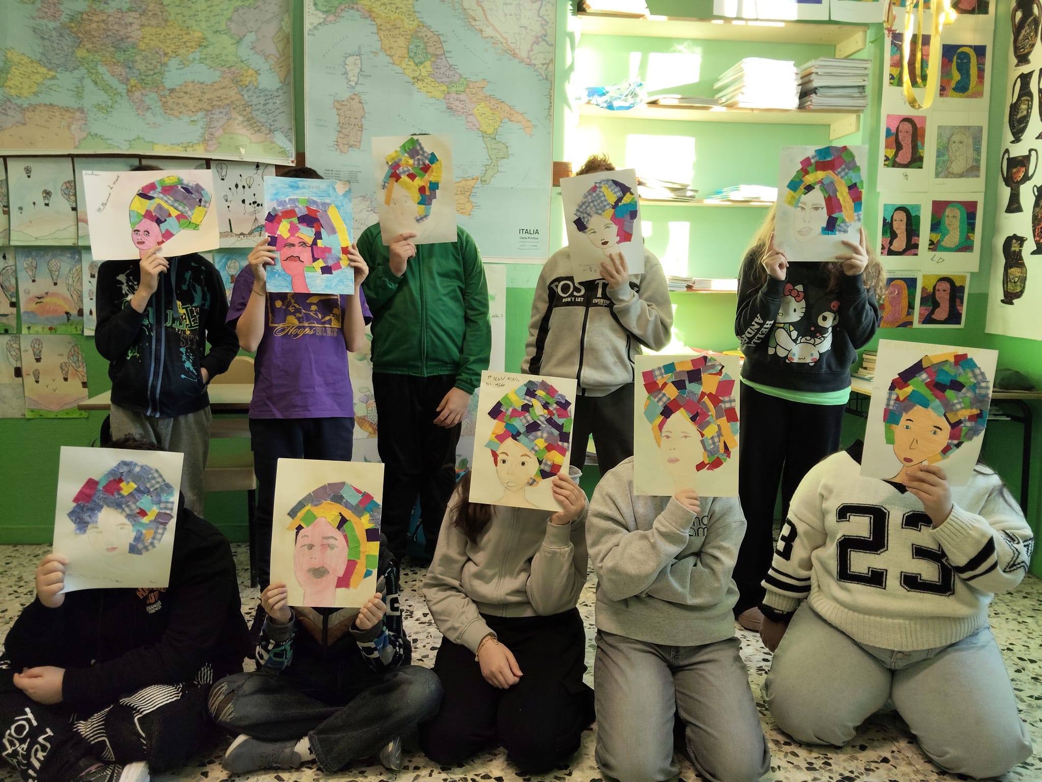 Gli alunni hanno realizzato ritratti ispirati allo stile di artiste come Frida Kahlo, arricchendo i capelli con collage di ritagli di stoffa e materiali di recupero.