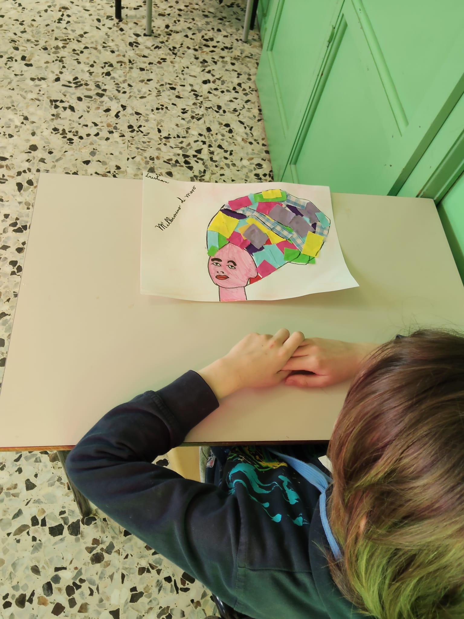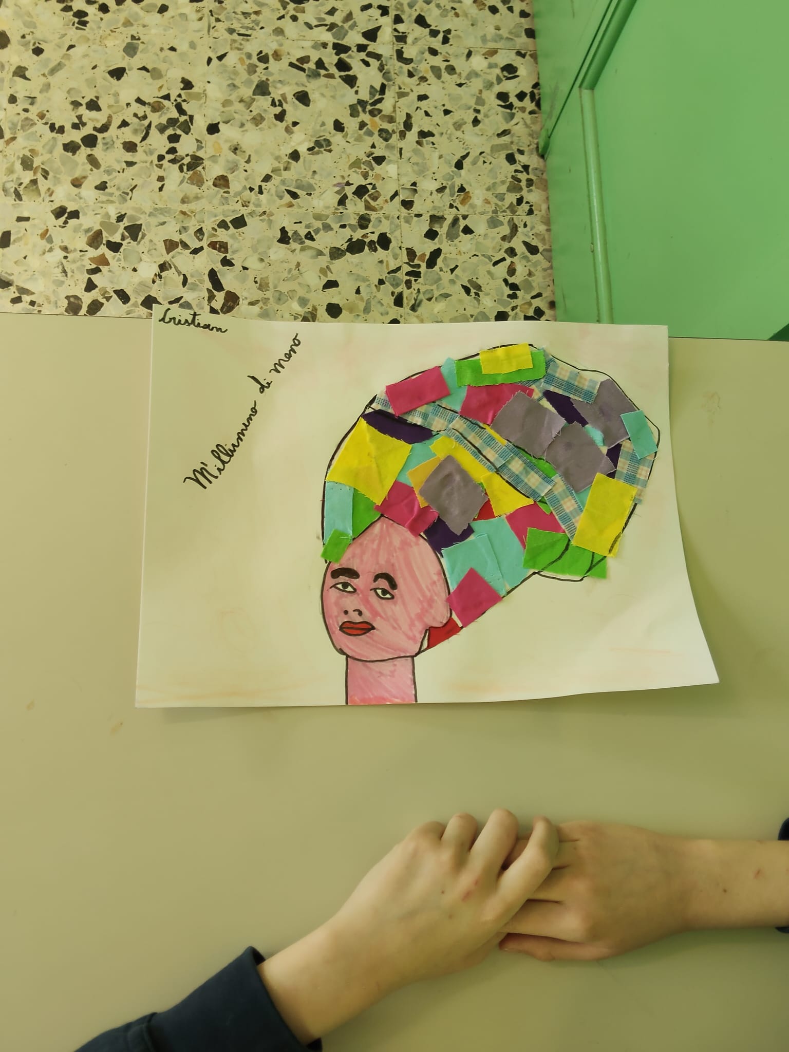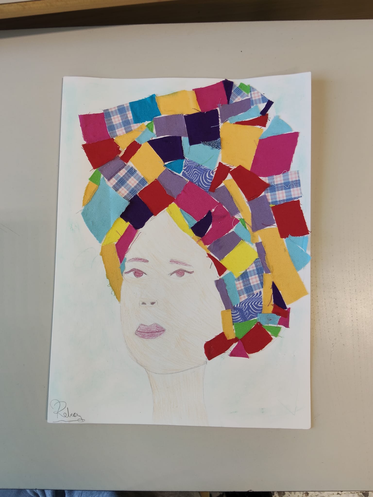 Gli alunni hanno realizzato ritratti ispirati allo stile di artiste come Frida Kahlo, arricchendo i capelli con collage di ritagli di stoffa e materiali di recupero.